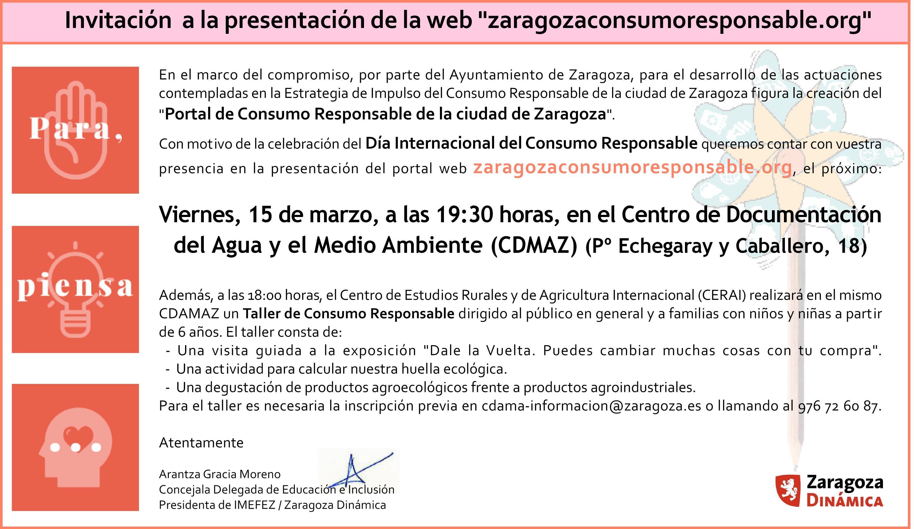 Con motivo de la celebración, el próximo viernes 15 de marzo, del Día Internacional del Consumo Responsable queremos compartir con todas vosotras y vosotros la presentación del portal web: https://www.zaragozaconsumoresponsable.org